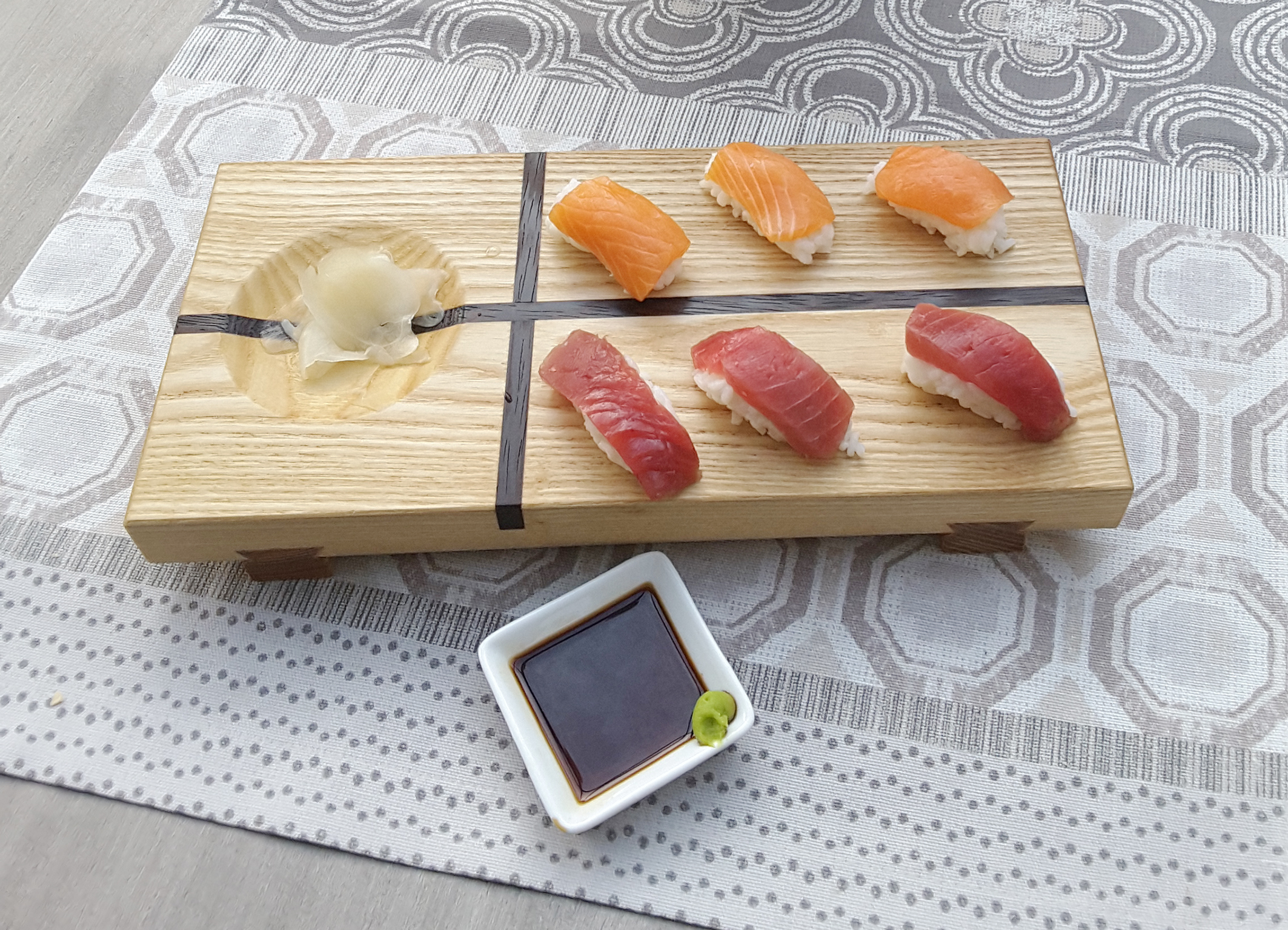 Massivholzbrettchen in Esche mit Zierleisten in Wenge und eingefräster Mulde für Wasabi, Ingwer oder Sojasauce auf eingegrateten Leisten. L320 x B150 x H45mm.